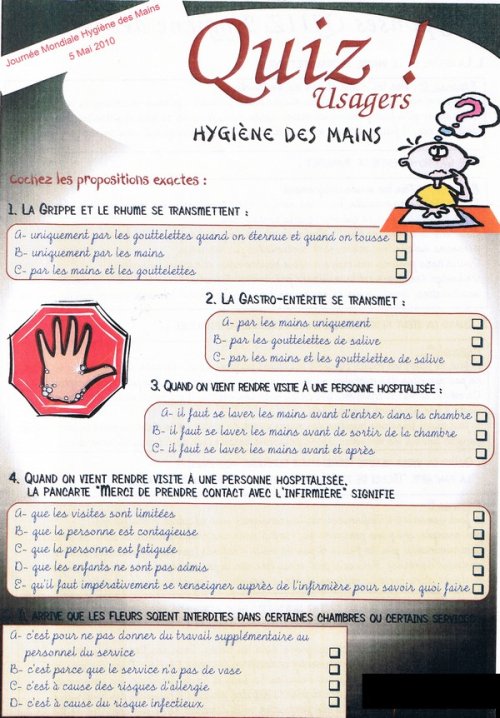 Ce qu’il faut c’est d ?-sin-fec-ter ...Ne pas apporter des microbes ? un malade, ne pas r ?cup ?rer les bact ?ries d’un malade pour les transporter ? d’autres : jeudi 6 mai avait lieu au P ?le Sant ? de Choisel la journ ?e du lavage de mains, en pr ?sence des directeurs du Centre Hospitalier et de la Clinique, et des deux responsables de CLIN : Elisabeth Ninin et Docteur Barrera.