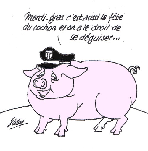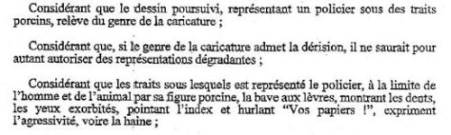 Placid explique : " Pendant ce proc ?s j’ai produit des photocopies d’œuvres de dessinateurs c ?l ?bres pour leurs portraits ou caricatures de policiers (Sin ?, Cabu, etc.). Ce qui semblait m’ ?tre reproch ? ?tait le nez retrouss ? du policier, proche du nez d’un cochon.