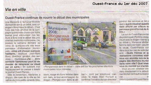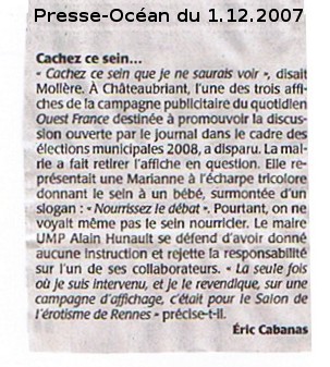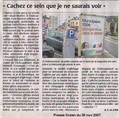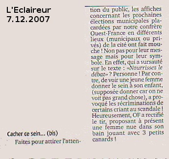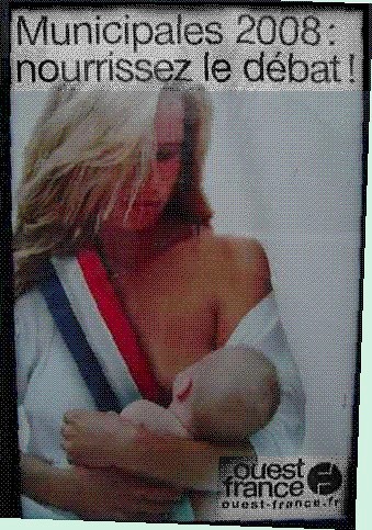 Et puis l’auteur du blog ?crit : « ?En France, lors des derni ?res ?lections municipales, le quotidien Ouest-France fit imprimer plusieurs affiches dans le but d’inciter les ?lecteurs ? se rendre aux urnes. L’une d’elles repr ?sentait une femme ceinte d’une ?charpe tricolore allaitant son enfant, accompagn ?e du slogan ? : » ?Nourrissez le d ?bat.?« . La prise de vue, de face, ne d ?couvrait pas totalement sa poitrine. Cela n’emp ?cha pas le maire de Ch ?teaubriant (Loire-Atlantique) de faire retirer l’affiche sur le territoire de sa commune, au pr ?texte que » ?des gens s’ ?taient plaints ?« . Certes () le premier magistrat de Ch ?teaubriant s’est empress ? de rendre l’un de ses collaborateurs responsable ; c’est possible, mais notons ?qu’il s’est toutefois bien gard ? de r ?tablir l’affiche, une fois » ?l’erreur ?« constat ?e ? »
