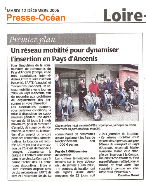 Sur les six premiers mois de l’ann ?e 2006, on compte 111 contrats de location, pour 2293 journ ?es, essentiellement pour le travail. Selon Presse Oc ?an du 12 d ?cembre, qui cite Marie-Fran ?oise Jaafar, ?lue charg ?e de l’insertion, ce r ?seau « peut ?tre consid ?r ? comme un v ?ritable outil d’insertion ». Actuellement le Pays d’Ancenis vient d’acheter 5 scooters neufs. Il a re ?u pour cela une subvention du Conseil G ?n ?ral.