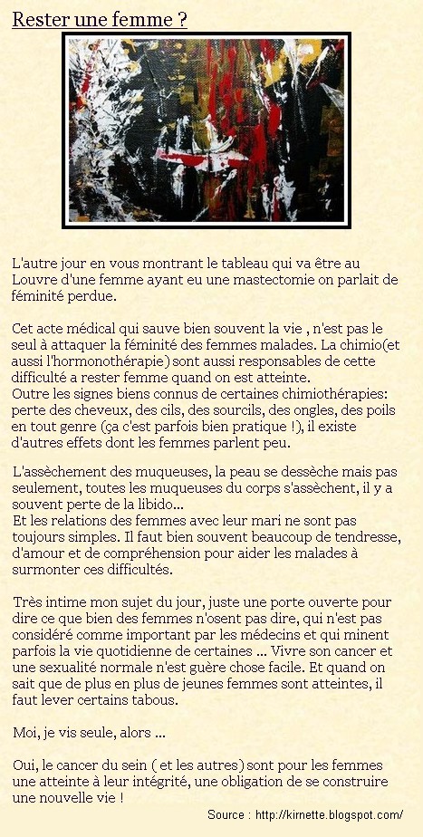 Cette info est extraite du blog d’une jeune femme, Kirnette, qui elle aussi, lutte contre ce qu’elle appelle « ?mon crabe ? ». Une lutte faite d’attente et d’espoir. Le blog est une aide pour elle-m ?me et pour ses visiteurs, malades ou non, d’autant plus que de tr ?s beaux textes accompagnent ses peintures.
