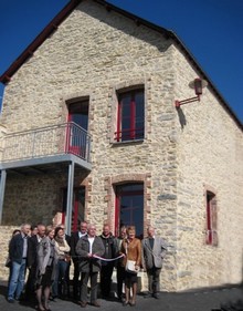 Le b ?timent a gard ? son volume d’origine. A l’arri ?re, un escalier m ?tallique pourvu d’un palier interm ?diaire permet l’acc ?s ? l’ ?tage par une fen ?tre transform ?e en porte. « ?Les menuiseries ext ?rieures en aluminium de couleur bordeaux sont du m ?me coloris que celles de la mairie et participent ? l’identit ? que nous voulons donner ? notre bourg ? » dit encore le maire. Au rez de chauss ?e, il y a une salle de 70 m ? qui peut accueillir des r ?unions (une cinquantaine de personnes), elle est ?quip ?e d’un espace informatique. Dans l’imm ?diat, elle accueille l’exposition « ?Communiquer c’est r ?sister ? ».