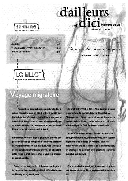 L’association « Rencontres », est engag ?e depuis plusieurs ann ?es, sur des actions de recueil de paroles aupr ?s de Castelbriantais d’adoption venus de pays lointains ou de r ?gions de France sur le th ?me du voyage migratoire. Ce travail de collectage est destin ? ? t ?moigner des itin ?raires de vie de ces migrants (hommes et femmes), et de leurs enfants.
