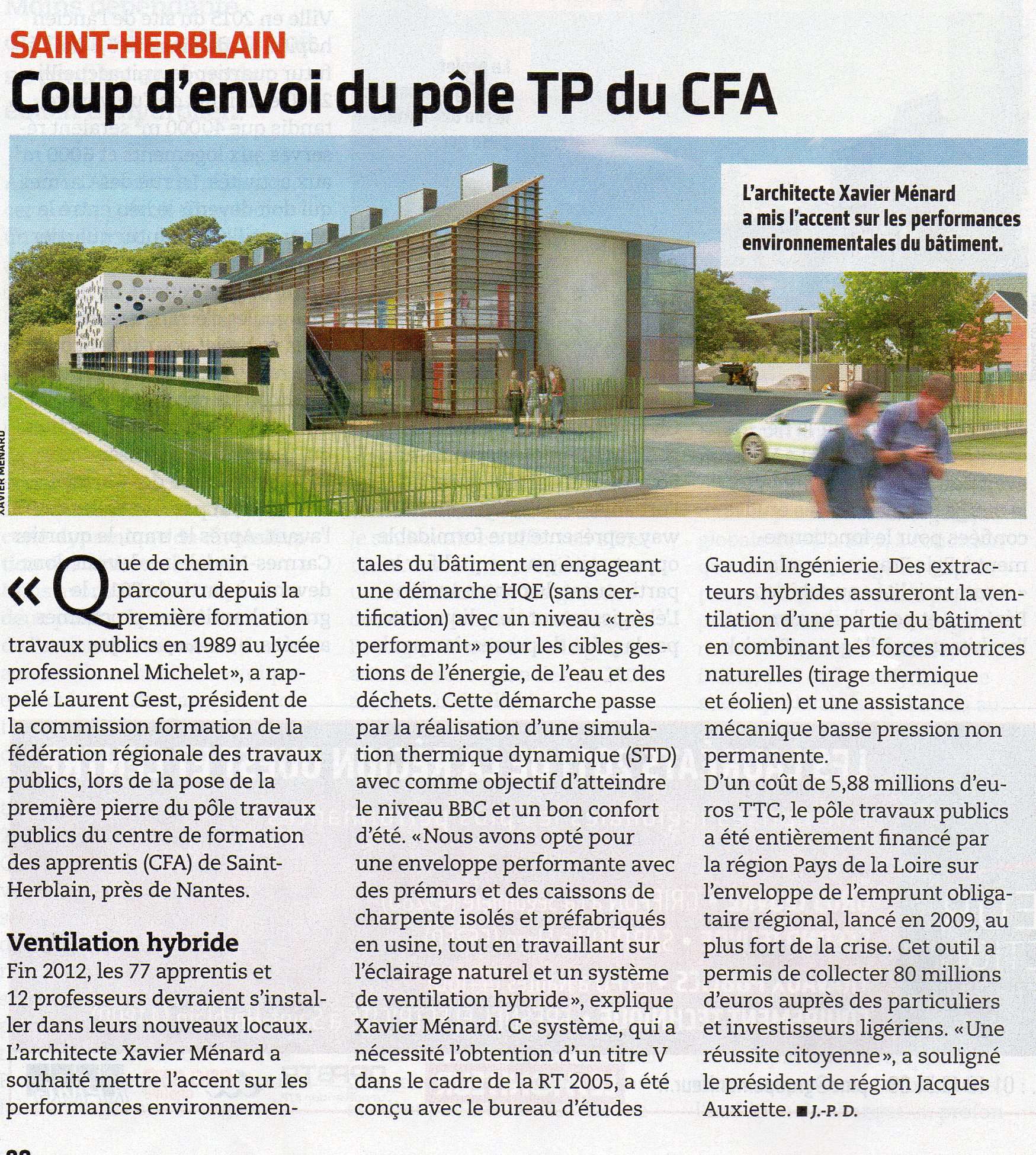 « Une ?tonnante envie de concevoir, de b ?tir et de tirer les le ?ons de chaque exp ?rience » dit la revue « Le Moniteur » du 12 novembre 2011 en brossant le portrait de Xavier m ?nard, architecte ? Ch ?teaubriant. En voici des extraits : « Xavier m ?nard a conserv ? l’id ?e d’une architecture pleine d’ ?l ?gance, de simplicit ? et de puret ?. »Plus mes projets sont simples, mieux je me sens« » explique cet architecte passionn ? par les espaces d ?sertiques. « » Un architecte est d’abord un entrepreneur « dit-il » C’est un b ?tisseur doubl ? d’un ?conomiste qui a la volont ? de faire des b ?timents fonctionnels, avec une qualit ? d’espace int ?rieur et ext ?rieure « pr ?cise ce g ?rant d’une agence de 13 personnes install ? depuis 1973, ? Ch ?teaubriant. » Le style m’importe peu. Je suis obnubil ? par le souci de construire des b ?timents qui fonctionnent et qui s’ins ?rent bien " pr ?cise-t-il.