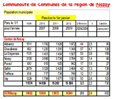 La Com’Com’ de Nozay (qui correspond au canton, moins La Chevallerais) est ?galement en progression de 2,4 % et dans toutes les communes [mais moins que dans la Com’Com de Derval] avec ralentissement sur Saffr ? et Vay, maintien d’un bon d ?veloppement sur Abbaretz et La Grigonnais et d ?but d’acc ?l ?ration sur Nozay et Puceul