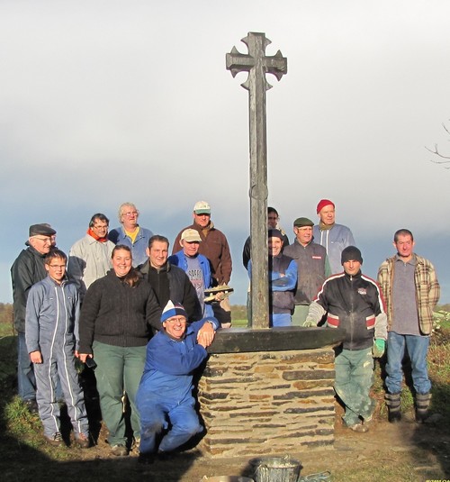 Rapidement la petite ?quipe entame la coul ?e des fondations du socle, et trois jours plus tard, le socle est compl ?tement termin ?. La remise en place de la croix a eu lieu le mercredi 14 d ?cembre 2011 sous une pluie quasi continuelle, avec de nouveau, l’aide de l’ ?l ?vateur de J ?r ?me Lallou ?, Bernard H ?as chef de chantier de l’aCPM , dirigeait les op ?rations, avec des membres de l’association. Manœuvre d ?licate car il fallait glisser la croix de 3 m dans son emplacement ? travers la dalle monolithe, caler le tout avec seulement du sable selon les m ?thodes anciennes