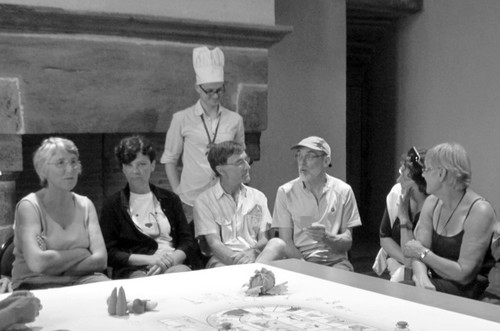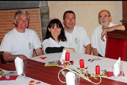 Sous le toit en berceau de la biblioth ?que du ch ?teau, devant l’antique chemin ?e en schiste, une table d’amis est dress ?e. Nappe blanche, chemin de table couleur fauve, p ?tales de tulipe, bougeoir et verres ? pied ? : un repas inattendu a ?t ? pr ?par ? pour les convives de la Rando-M ?e ? : Claude Bouron, Anne Bailleul, Luc Gourin, Claude Letourneux, annoncent le programme. (voir ces personnes sur la photo ci-contre)