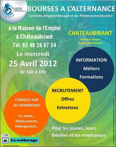 La Bourse ? l’alternance aura lieu cette ann ?e le 16 avril 2014 de 15 h ? 18 h ? la Maison de l’emploi, 16 rue G.Delatour ? Ch ?teaubriant, organis ?e par le Service Public de l’emploi (Mission Locale, Agence pour l’Emploi, Centre d’information et d’orientation)