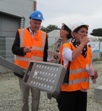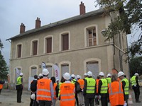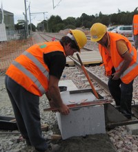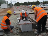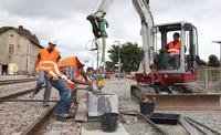 Plein de beau monde ce 2 septembre 2012, pour faire le point sur l’avanc ?e des travaux du tram-train. En gare de Nort sur Erdre les ouvriers posent les quais ? : un gabarit donne la bonne distance avec les rails, un niveau ? bulle garantit la l ?g ?re pente n ?cessaire pour ?vacuer les eaux de pluie. La barre ? mine assure les derniers ajustements. Ces quais sont con ?us pour permettre une accessibilit ? optimale au tram-train, y compris pour les personnes ? mobilit ? r ?duite.