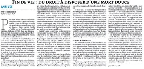 Le Comit ? Consultatif National d’Ethique a rendu, le 1er juillet, son avis concernant la fin de vie. Ses membres n’ont pas r ?ussi ? trouver un accord unanime. La majorit ? exprime des r ?serves majeures et recommande de ne pas modifier la loi actuelle, estimant qu’elle op ?re une distinction essentielle entre « laisser mourir » et « faire mourir ». Ils consid ?rent que le maintien de l’interdiction faite aux m ?decins de « provoquer d ?lib ?r ?ment la mort » prot ?ge les personnes en fin de vie, et qu’il serait dangereux pour la soci ?t ? que des m ?decins puissent participer ? « donner la mort ». En ce qui concerne plus sp ?cifiquement l’assistance au suicide, ils estiment « que cette l ?galisation n’est pas souhaitable ? ».