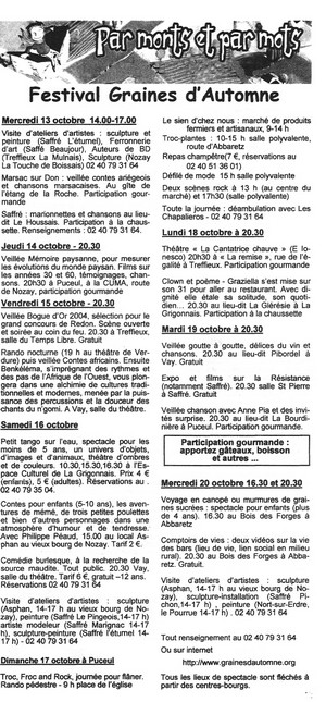 Cet ?v ?nement a ?t ? r ?fl ?chi et nourrit aussi la r ?flexion sur le territoire, la culture, l’identit ? en milieu rural : « Un territoire existe r ?ellement pour sa population quand celle-ci s’y identifie d’une fa ?on positive et valorisante, d’ou l’importance des actes f ?d ?rateurs qui rassemblent. L’identit ? territoriale c’est du pass ?, du pr ?sent, du futur commun que s’approprient les habitants. Quand le territoire n’a pas d’objet f ?d ?rateur naturel li ? ? l’histoire ou ? la g ?ographie, le support culturel est un bon moyen pour mobiliser les gens dans l’action et dans la construction d’un projet commun (on cr ?e alors la base f ?d ?ratrice). Le festival GRAINES D’AUTOMNE a apport ? depuis 1996 de la consistance » identitaire « ? la Com. Com. de NOZAY, il est devenu une r ?f ?rence forte, vue de l’ext ?rieur, et un support valorisateur pour l’image de la r ?gion. Le festival ?tant proche des gens, il suscite une adh ?sion naturelle. » (extrait des textes disponibles sur le site internet).