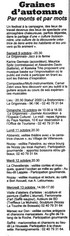 Le festival Graines d’Automne 2004 s’est termin ? il y a deux semaines. La question qui me hante est « comment r ?sumer cet ?v ?nement ? ». Pour ceux qui se sentent peu int ?ress ?s par mes p ?r ?grinations c ?r ?brales parfois tortueuses, je vous conseille d’aller directement au dernier paragraphe. Pour les autres, accrochez-vous, on d ?colle !