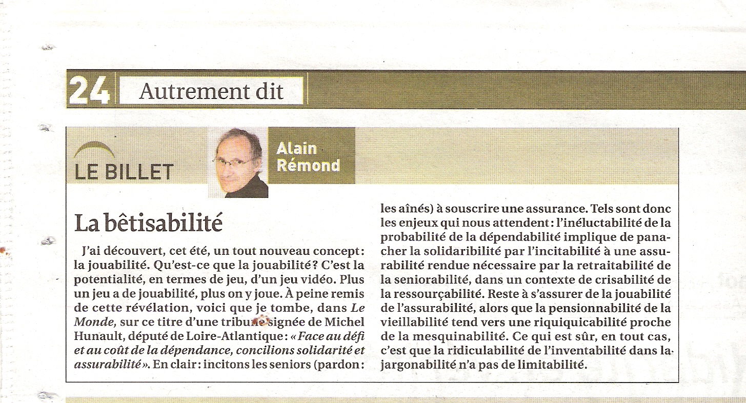 Reste à s’assurer de la jouabilité de l’assurabilité, alors que la pensionnabilité de la vieillabilité tend vers une riquiquicabilité proche de la mesquinabilité.