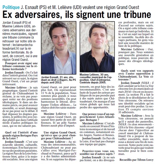 Une ’’tribune’’ co-sign ?e Maxime Leli ?vre (UDI) - Jordan Esnault (PS), a ?t ? envoy ?e ? Ch ?teaubriant-actualit ?s, ? Ouest-France et ? l’Eclaireur. Curieusement La M ?e n’en a pas ?t ? destinataire. Oubli volontaire ?? Significatif en tout cas ?!