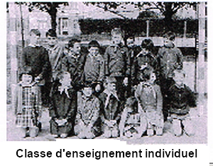 En 1962 a ouvert la première classe d’enseignement individuel à Châteaubriant, à l’école de Béré. « En attente de titularisation, j’avais fait deux ans dans un institut médico-pédagogique à Gesvres, là j’ai découvert les enfants en grandes difficultés. Par chance, nous avions une réunion tous les soirs entre institutrices, éducatrices, psychologue. Alors, quand j’ai été recrutée par M. Dupari, inspecteur primaire, j’ai été appelée à faire passer aux enfants le test Binet-Simon, pour déterminer le développement intellectuel et psychologique desenfants ». Tout naturellement, YannickFerré est chargée d’une classe d’ensei-gnement individuel (CEI) « C’était dans unbâtiment préfabriqué, conçu à l’originepour des classes de 30 élèves. Il avait été séparé pour faire deux classes, les cloisons n’arrivaient même pas jusqu’au pla-fond ! ». L’année suivante, Yannick s’occupe d’une classe analogue aux Terrasses mais, n’étant pas titulaire de son poste, elle est nommée à Issé en maternelle à la rentrée de 1964. Enfin, en 1965, elle a un poste à Châteaubriant, en CEI, dans les bâtiments « Aristide Briand » (devenus, par la suite, école de musique, et maintenant quasiment désaffectés). Elle y restera jusqu’en juin 1970.