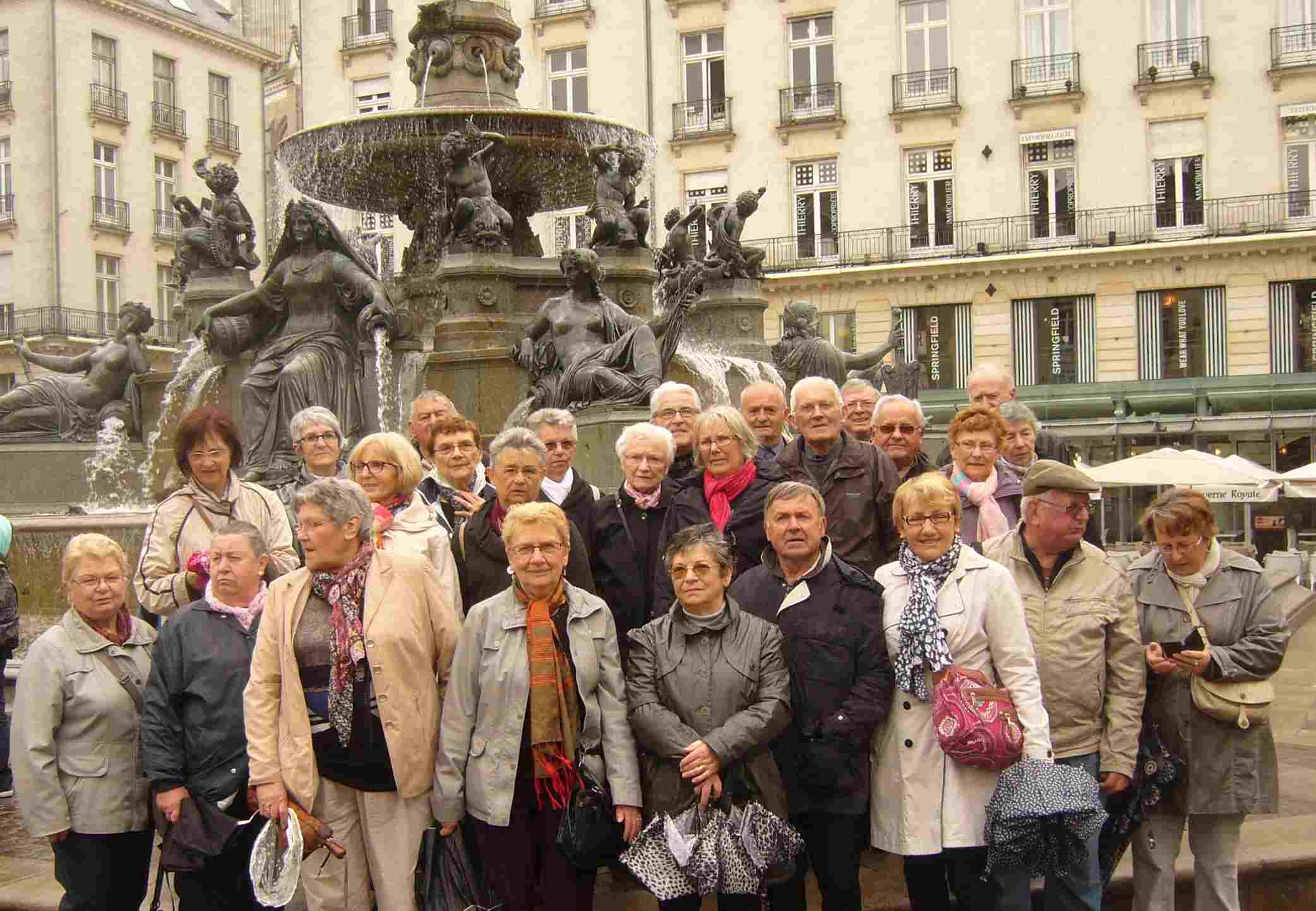 27 personnes ?g ?es du Club g ?n ?rations Mouvement d’Erbray, ont pris le tram-train le 30 avril, « ?malgr ? un temps pourri, nous avons pass ? une journ ?e tr ?s sympathique, visite de la cath ?drale - place Royale - Passage Pommeraye - place Graslin - d ?je ?ner ? la brasserie LA CIGALE ouverte depuis le 1er avril 1895 - class ?e monument historique depuis le 12 octobre 1964 - Tour Bretagne avec mont ?e au 32e ?tage pour une pause au NID et point de vue ? 360 ? sur la m ?tropole (quand il fait beau)- travers ?e rapide du Jardin des Plantes et retour ? la gare pour retrouver le train.? »