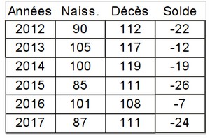 l’ann ?e 2016 avait ?t ? faste avec 101 naissances, mais l’ann ?e 2017 est peu glorieuse avec un solde naturel n ?gatif important : -24 habitants. Moyenne : une perte de 18 habitants par an. Heureusement des arriv ?es de nouveaux habitants compensent en partie cette baisse.