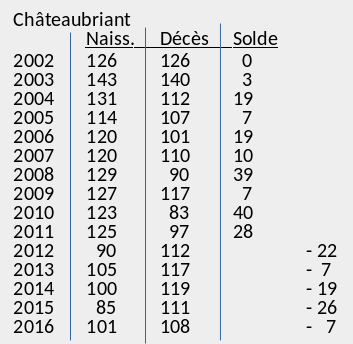 Par voie de presse, le maire de Ch ?teaubriant s’est r ?joui : en 2016 il y a eu davantage de naissances. Ah oui, 101. Compte tenu des d ?c ?s, 108 en 2016, la ville de Ch ?teaubriant a encore un solde naturel n ?gatif de 7 personnes. A noter que le solde est n ?gatif depuis 2012.