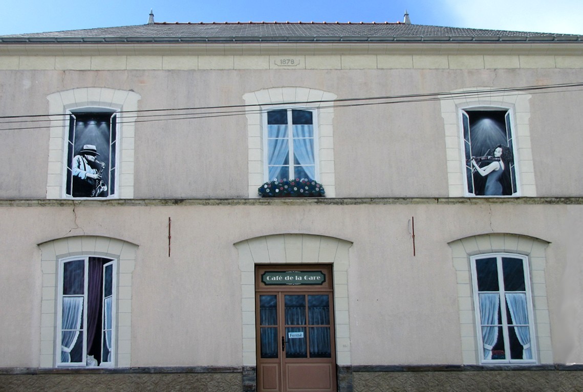 La gare SNCF d’Abbaretz est fort mal signal ?e ? : il faut savoir la d ?nicher en p ?riph ?rie de la commune. Tout pr ?s du vaste parking, on y trouve le « ?caf ? de la gare ? », ferm ?. Mais au rez-de-chauss ?e un chat veille sur la porte d’entr ?e, ? l’ ?tage une jeune fille joue du violon en ?cho et contrepoint au joueur de saxo qui lui fait face par la fen ?tre voisine. Tendez l’oreille ? : vous n’entendrez aucune musique si ce n’est le chant des oiseaux qui parfois se perchent sur les fils ?lectriques qui barrent la fa ?ade.
