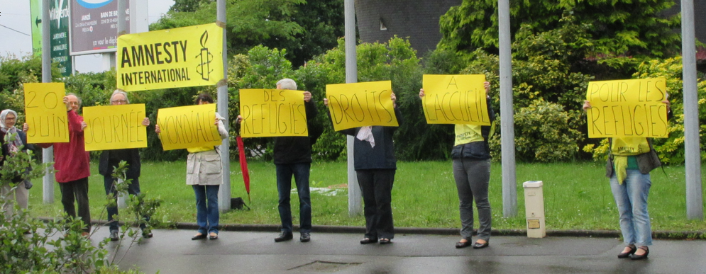 20 juin - Journ ?e mondiale des r ?fugi ?s. Le groupe de Ch ?teaubriant d’Amnesty International France s’est mobilis ? aupr ?s du public et des autorit ?s fran ?aises pour que les r ?fugi ?s ne soient plus contraints d’emprunter des routes dangereuses et de risquer leur vie pour se mettre ? l’abri. Le public a ?t ? appel ? ? d ?livrer un visa symbolique pour les r ?fugi ?s. La totalit ? des visas ainsi collect ?s ont ?t ? adress ?s aux responsables politiques fran ?ais en soutien ? la demande d’accueillir davantage de r ?fugi ?s.