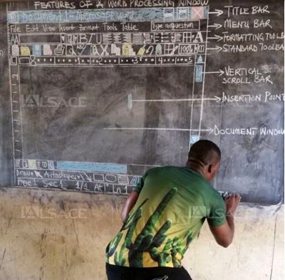 Richard Appiah Akoto, 33 ans, enseigne l’informatique dans l’ ?cole de Betenase au Ghana. Avec des craies multicolores, il a reproduit ? la perfection toutes les caract ?ristiques d’une fen ?tre du logiciel de traitement de texte Microsoft Word pour que ses ?l ?ves en int ?grent le fonctionnement.
