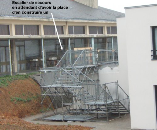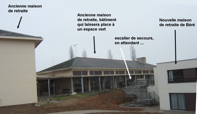 L’ancien b ?timent va ?tre conserv ? pour y faire des bureaux, mais la partie r ?fectoire va ?tre d ?molie pour construire l’issue de secours de la nouvelle r ?sidence. En attendant, une issue de secours, m ?tallique, a ?t ? am ?nag ?e provisoirement. Sans cela la maison n’aurait pas pu ouvrir.