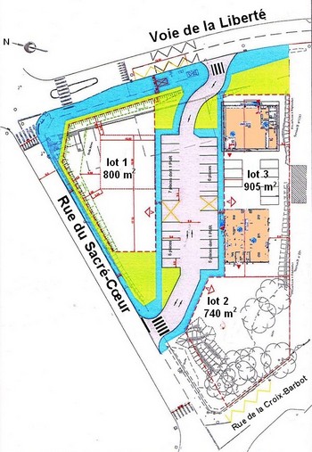 Le lot 1, de 800 m ?, sera disponible ? la vente. Le reste de la parcelle reste dans le domaine public pour les espaces, les parkings, la voirie, entre la rue de la Lib ?ration (route de Rennes) et la rue du Sacr ?-cœur, plus tranquille, qui rejoint la Rue de la Croix-Barbot et le centre-bourg.