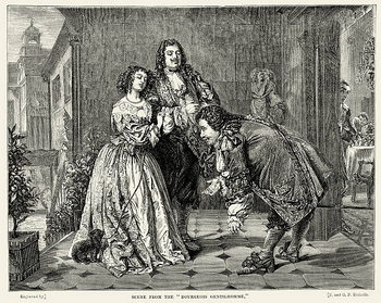 C’est donc en peignant les hommes tels qu’ils sont que Moli ?re montre la profondeur de son comique : il soul ?ve un rire sans retenue en p ?n ?trant les ?mes, en mettant au jour le ridicule inh ?rent ? certains vices ou ? certaines passions. La sc ?ne du Bourgeois Gentilhomme repr ?sent ?e dans la gravure ci-dessous est pr ?c ?d ?e par la c ?l ?bre le ?on du ma ?tre de philosophie, ? qui M. Jourdain avait demand ? conseil pour tourner ?l ?gamment un ? billet ? destin ? ? la marquise de qui il est tomb ? amoureux.
