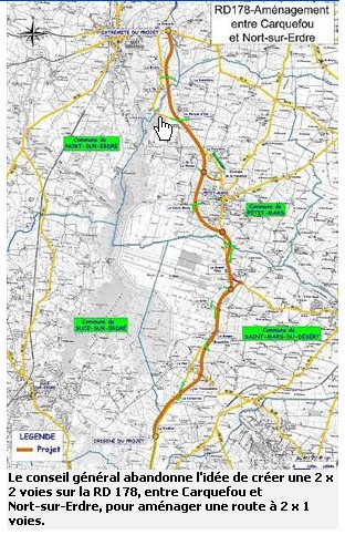 Le Conseil G ?n ?ral, cela fait bien longtemps, avait d ?cid ? d’am ?liorer la D 178, entre Nort sur Erdre et Nantes. Une « deux fois deux voies » ?tait pr ?vue, avec un trac ? le plus rectiligne possible . pour augmenter la tentation de la vitesse alors m ?me que la r ?glementation limite la vitesse Et puis les choses ont tra ?n ?. Pourtant, en 2001, tous les ?lus concern ?s ?taient d’accord sur les grandes lignes du trac ?.