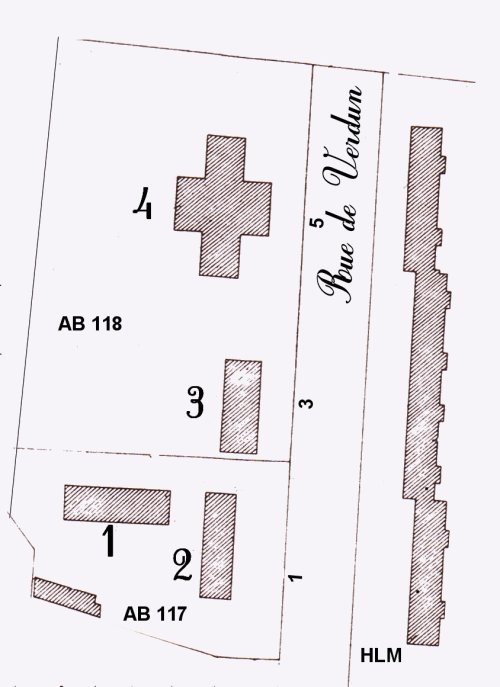 On se souvient que la gendarmerie occupait deux parcelles ? Ch ?teaubriant, le long de la rue de Verdun. Au n ?1 se trouvait la Compagnie (bureaux et logements) sur la parcelle cadastr ?e AB 117. Sur la parcelle cadastr ?e AB 118, au n ?3 se trouvait la Brigade (bureaux) et au n ?5 se trouvaient les 16 logements.