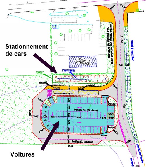 Une voie rectangulaire, autour d’un terre-plein destin ? ? accueillir 40 ? 60 voitures. l’acc ?s aux cars se fera ? l’aide de rampes sp ?cialement am ?nag ?es pour personnes handicap ?es. L’ensemble sera ?clair ? et se situera aupr ?s du b ?timent de « ?Vivre ? Domicile ? » sur la Zone de l’Oseraye, r ?pondant ainsi au besoin des nombreuses personnes qui, spontan ?ment, se garent d ?j ?? ? proximit ? pour limiter leurs frais de d ?placement.