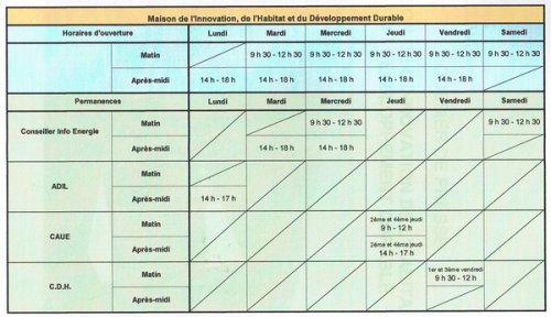 La Maison de l’Innovation, de l’Habitat, et du d ?veloppement Durable de Ch ?teaubriant propose une information et un conseil gratuit aux habitants en mati ?re de ma ?trise de l’ ?nergie et d’utilisation des ?nergies renouvelables, un hall d’exposition pr ?sentant les derni ?res innovations, et des bureaux mis ? disposition gracieusement des porteurs de projets avant leur cr ?ation d’entreprise ( incubateur) et ? loyer mod ?r ? pour les jeunes entreprises ( p ?pini ?re d’ ?co-entreprises).