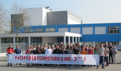 « ?Ici aussi l’Etat se d ?sengage ? » dit une banderole ? la porte du Coll ?ge Schuman ? Ch ?teaubriant o ? une classe de 3e sera supprim ?e ? la rentr ?e de septembre 2012. Tout ?a pour deux ?l ?ves. En effet l’effectif pr ?vu est de 118 ?l ?ves en 3e, soit deux classes de 30 et deux classes de 29 ?l ?ves. S’il y avait eu deux ?l ?ves de plus, cela aurait permis d’avoir 5 classes. « ?Depuis des ann ?es, il nous arrive toujours des ?l ?ves en cours d’ann ?e ? » dit Mme Duclos, parent d’ ?l ?ve FCPE . « ?S’il nous arrive 2 ?l ?ves de plus au cours de l’ ?t ? on n’ouvrira pas le 5e classe, car on ferme ? moins de 30 ?l ?ves et on rouvre si la moyenne est de 31 et si c’est possible ? ».
