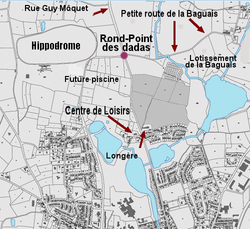 Revenons donc sur ce projet de lotissement (voir plan). Du point de vue du cadre de vie, les terrains seraient bien situ ?s, ? proximit ? des ?tangs, du Centre de Loisirs et de la future piscine. Mais c’est vrai qu’ils sont loin du centre-ville auquel on ne peut acc ?der que par l’ ?troite rue Guy M ?quet. Celle-ci d ?bouche sur la place Ernest Br ?ant o ? la circulation est difficile puis sur la place de la Motte o ? les travaux (non finis) rendent la circulation probl ?matique au point que nombre d’automobilistes l’ ?vitent d ?sormais. Le projet sera ainsi tr ?s tr ?s loin des commerces du centre-ville et de la zone industrielle et de l’ ?cole de B ?r ?. Les choses se compliqueront quand la future piscine sera r ?alis ?e.