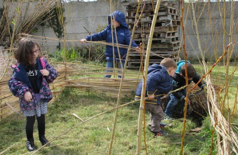 Le lieu est visit ? par les adh ?rents, mais aussi par les voisins et les enfants des ?coles, surtout quand il y a des petits fruits rouges. Une cabane ? outils a ?t ? construite par l’association, une citerne r ?cup ?re l’eau de pluie. Sophie Boudet, Sophie Floquet et Marie Paule m ?chineau y accueillent les enfants des TAP (Temps d’Activit ? p ?ricolaire) et du centre de loisirs. Ce 7 avril les enfants ont sem ? des radis, du panais, et des petits pois, et ont poursuivi l’ ?dification d’un abri aux parois tress ?es. « ?Pour l’automne nous souhaitons faire pousser courgettes, poireaux, choux, toujours en permaculture et proposer un soir de f ?te autour d’une bonne soupe ? » disent les militantes.