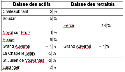 Dans les 33 communes, la baisse du nombre des retrait ?s n’a affect ? que deux communes ? : Ferc ? et Grand Auvern ?. Dans cette derni ?re il y a eu aussi une baisse du nombre d’actifs.