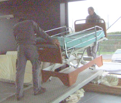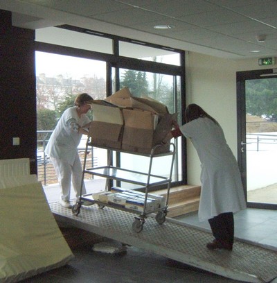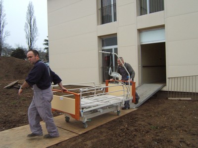 Le d ?m ?nagement des lits s’est fait le lundi matin sur un « chemin de planches » reliant l’ancienne maison et la nouvelle.