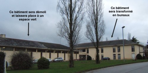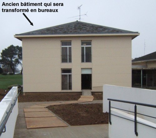 L’ancien b ?timent va ?tre conserv ? pour y faire des bureaux, mais la partie r ?fectoire va ?tre d ?molie pour construire l’issue de secours de la nouvelle r ?sidence. En attendant, une issue de secours, m ?tallique, a ?t ? am ?nag ?e provisoirement. Sans cela la maison n’aurait pas pu ouvrir.