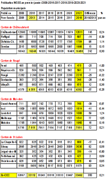 Bernard Gaudin, pour le groupe Ch ?teaubriant-Ecologiste et Solidaire, analyse ? : " ?Franchir la barri ?re symbolique des 12 000 habitants est devenu chaque fin d’ann ?e l’enjeu de la publication des donn ?es Insee pour Ch ?teaubriant.. Au 1er janvier 1999, la population municipale ?tait de 12065 habitants, 20 ans plus tard elle est de 12 011 habitants au 1er janvier 2018. Pour la p ?riode de 2013 ? 2018 la variation annuelle est de + 0,24 % pour la ville et de 0,21% pour la communaut ? de communes (soit un gain de 469 habitants). Des ?volutions tr ?s ?loign ?es de celles constat ?es sur l’ensemble du d ?partement ? : 1,28% (+83 728) et dans les territoires voisins ?des communaut ?s de communes de ? : Nozay 0,98 ?(+748) ; Blain 0,67 (+ 532) ? ; Erdre et Gesvres 1,91% (+5504) et Ancenis 0,84 (+2616). Cette comparaison est r ?v ?latrice du manque d’attractivit ? du territoire de Ch ?teaubriant Derval.